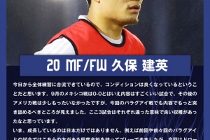 久保建英表示:“从今天起我能够参加全队合练,感觉自己的状态正逐渐在恢复。9月份与墨西哥队的比赛,我认为从比赛内容来说踢的很不错,这之后与美国队的比赛有些遗憾,而本周与巴拉圭的比赛从内容上看我们展现出到最后都不放弃的毅力,在我看来,这三场比赛我们在不同层面上都有所收获。”