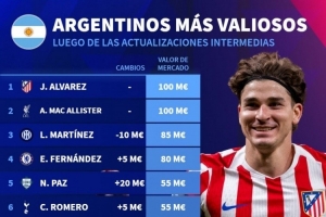 体育资讯10月18日讯 德国转会市场更新了部分球员的身兼,并列出阿根廷球员德转身价排名,阿尔瓦雷斯、麦卡利斯特1亿欧居首。