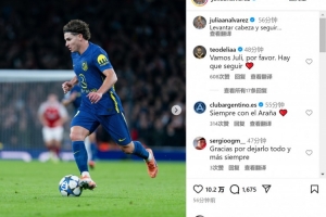 马竞前锋阿尔瓦雷斯此役踢满全场,赛后他在社交媒体上晒出比赛照片,配文:“抬起头,继续前进。”