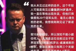 墨菲:我从未见过这样的选手。这个年轻人可能是我见过最强的14岁选手。我一直在等他出现失误,但他打得像拥有20个冠军头衔、毫无心理负担的老将。我想我刚刚见证了斯诺克的未来。