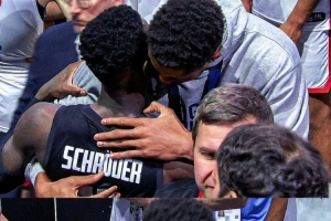 比赛赛后,同时入选最佳阵容的字母哥和施罗德拥抱致意。对此,施罗德表示:“扬尼斯做出了非常棒的举动,他主动来找我,说我们各自代表德国和希腊为国征战,而他这次也终于为希腊队赢得了首枚大赛奖牌。我对他只有敬佩——他有四个可爱的孩子、贤惠的妻子,还有始终陪伴他的兄弟,一家人都在为篮球事业努力。更不用说他在NBA赛场上的表现,那完全是另一个级别的存在,绝对是世界顶尖球员之一。他主动过来和我交流,这种举动充满了体育精神,非常难得。他还说一直在看我们球队的YouTube视频,我觉得这种跨国家的球员互动,对希腊和德国的篮球交流也很有意义。”
